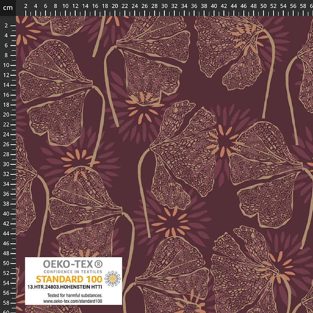 En flot og rolig Avalana bomuldsjersey med et grafisk ginkgo-blad print i varme nuancer på en dyb bordeaux bund. Printet har et moderne udtryk og passer virkelig godt til enkle snit, hvor mønsteret får lov at stå frem – både til hverdag og lidt pænere brug.