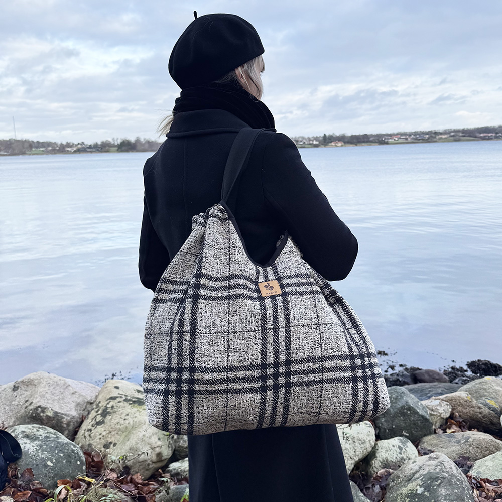 Denne skuldertaske syes i kraftigt stof med tern, indvendig er tasken foret.