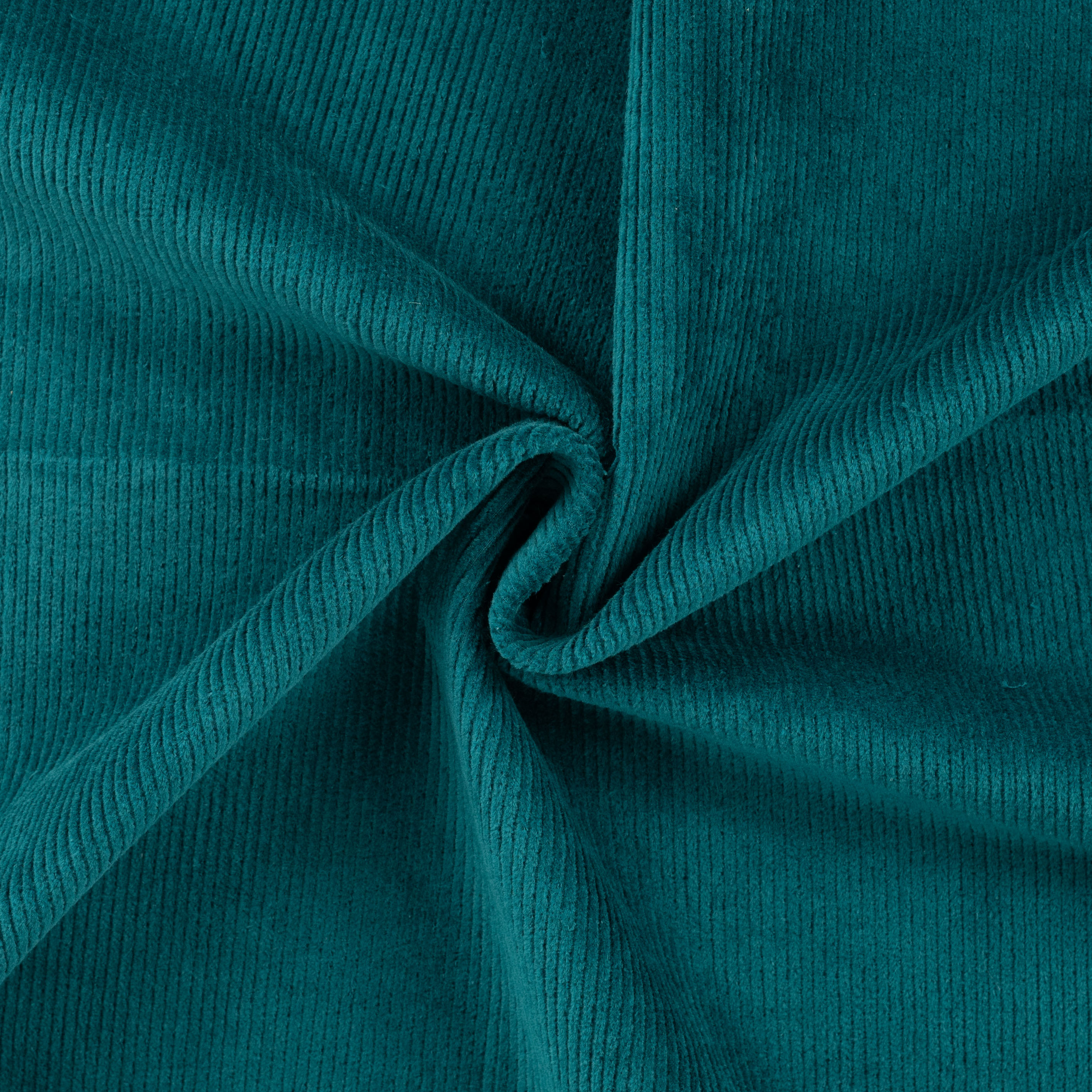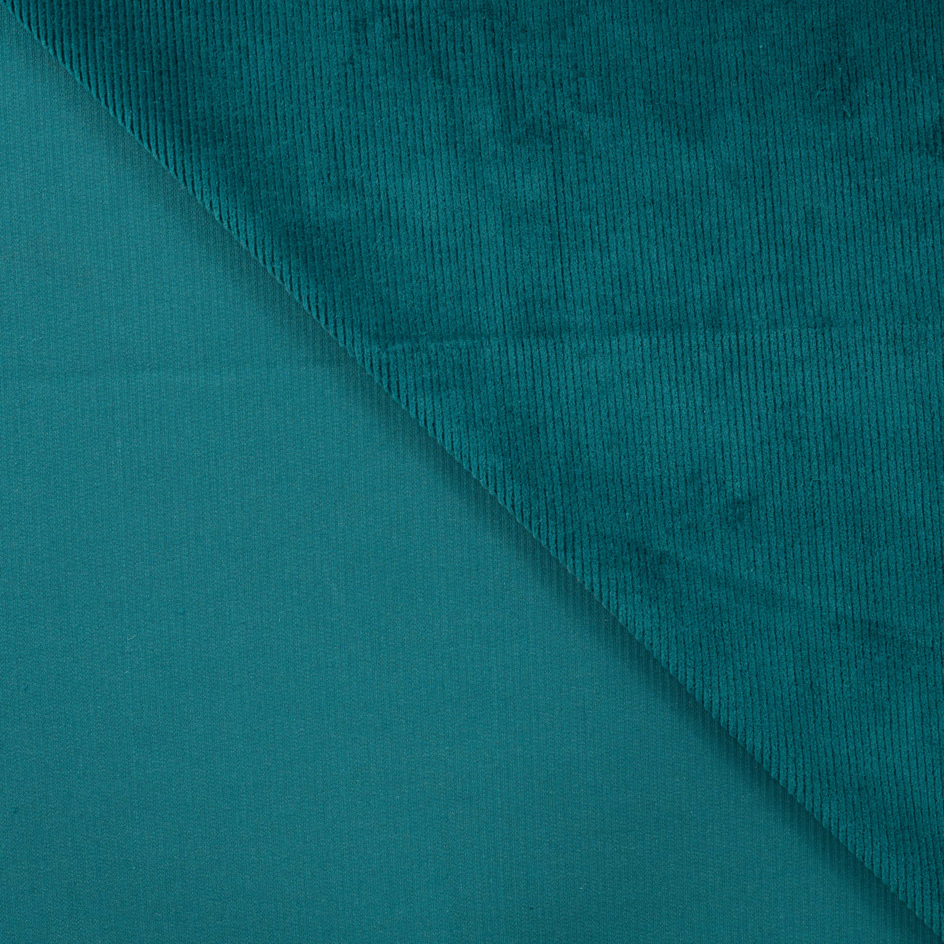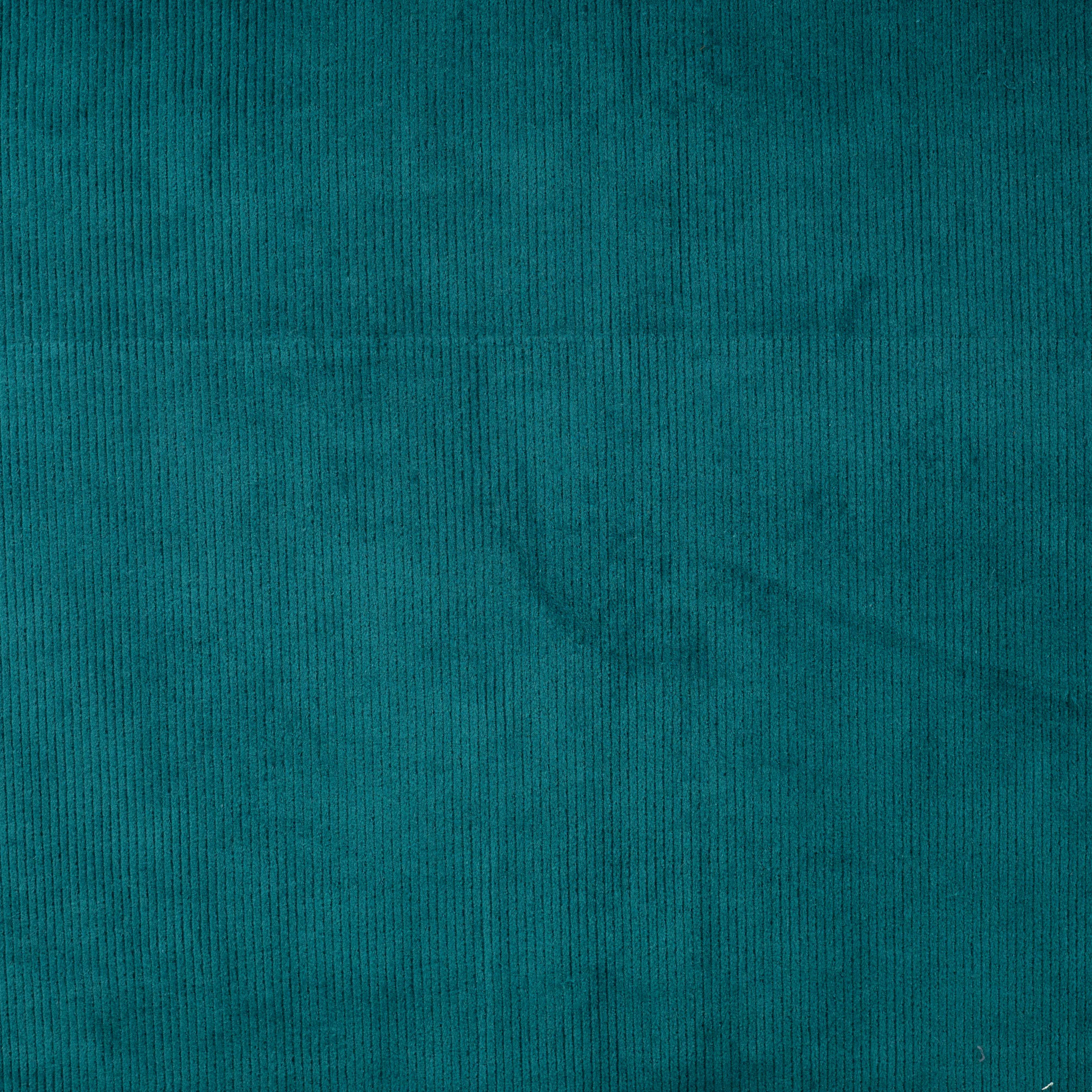 En smuk og dyb petrolfarvet fløjl med de karakteristiske brede rifler, der giver stoffet et moderne og levende udtryk. Den blågrønne tone er både elegant og iøjnefaldende – perfekt til projekter, der gerne må skille sig ud.