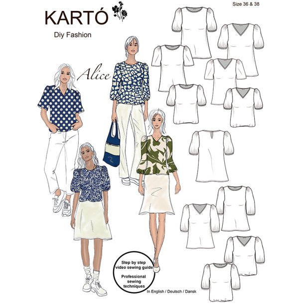 Alice er en alsidig bluse med et feminint udtryk og mange designvalg. Den har karakteristiske pufærmer, som fås i forskellige længder, og kan afsluttes på to måder: enten med en enkel oplægning eller ved at rynke ærmekanten og afslutte med et skråbånd klippet i samme stof – en smuk og gennemført detalje.