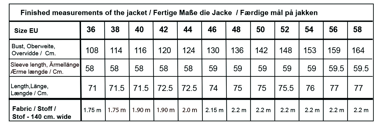 Skemaet viser de færdige mål på jakken.