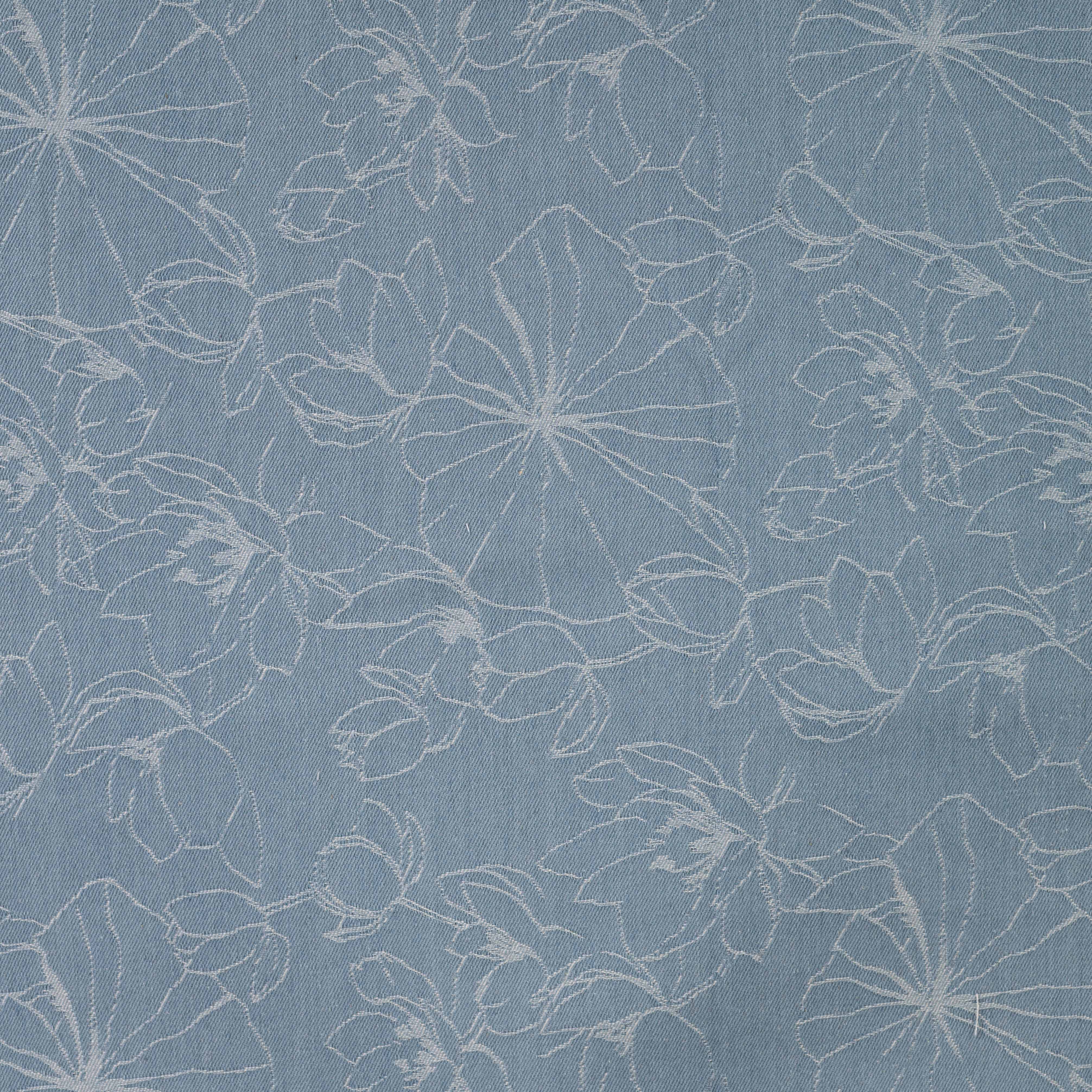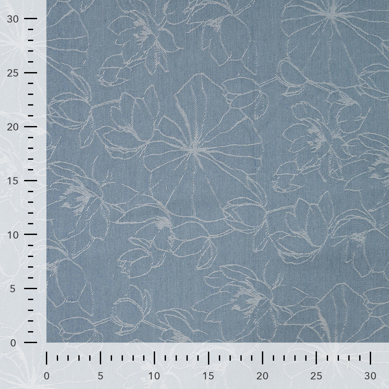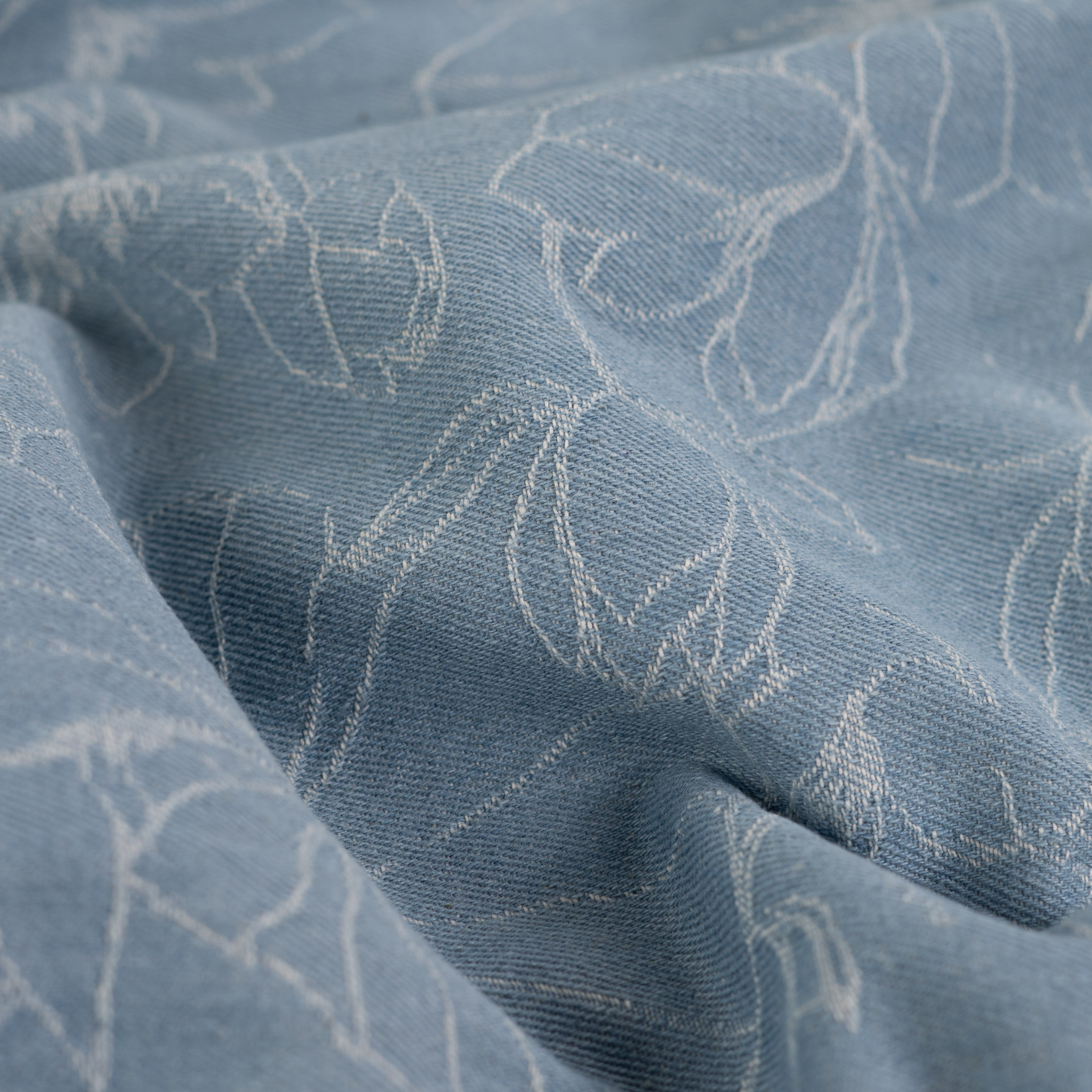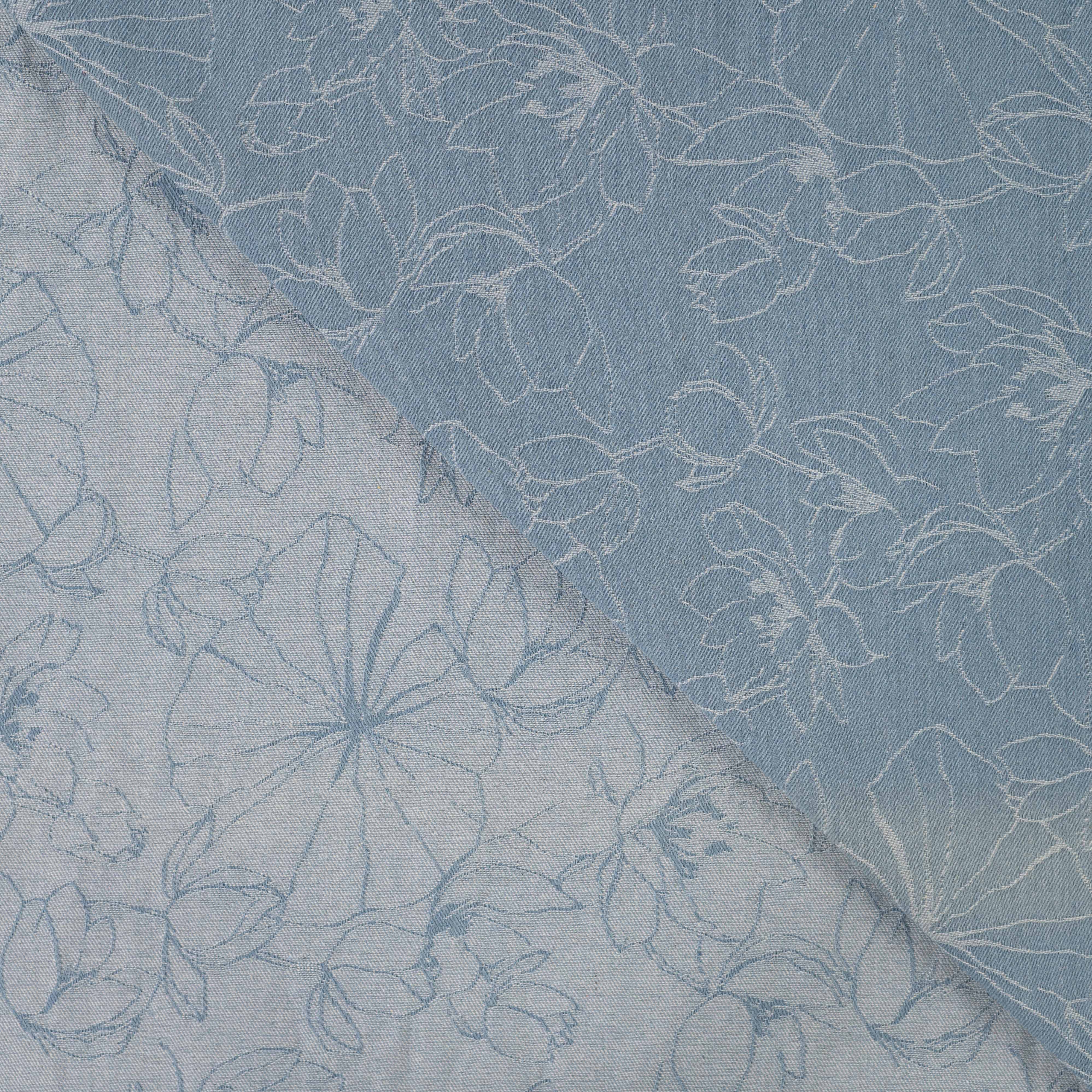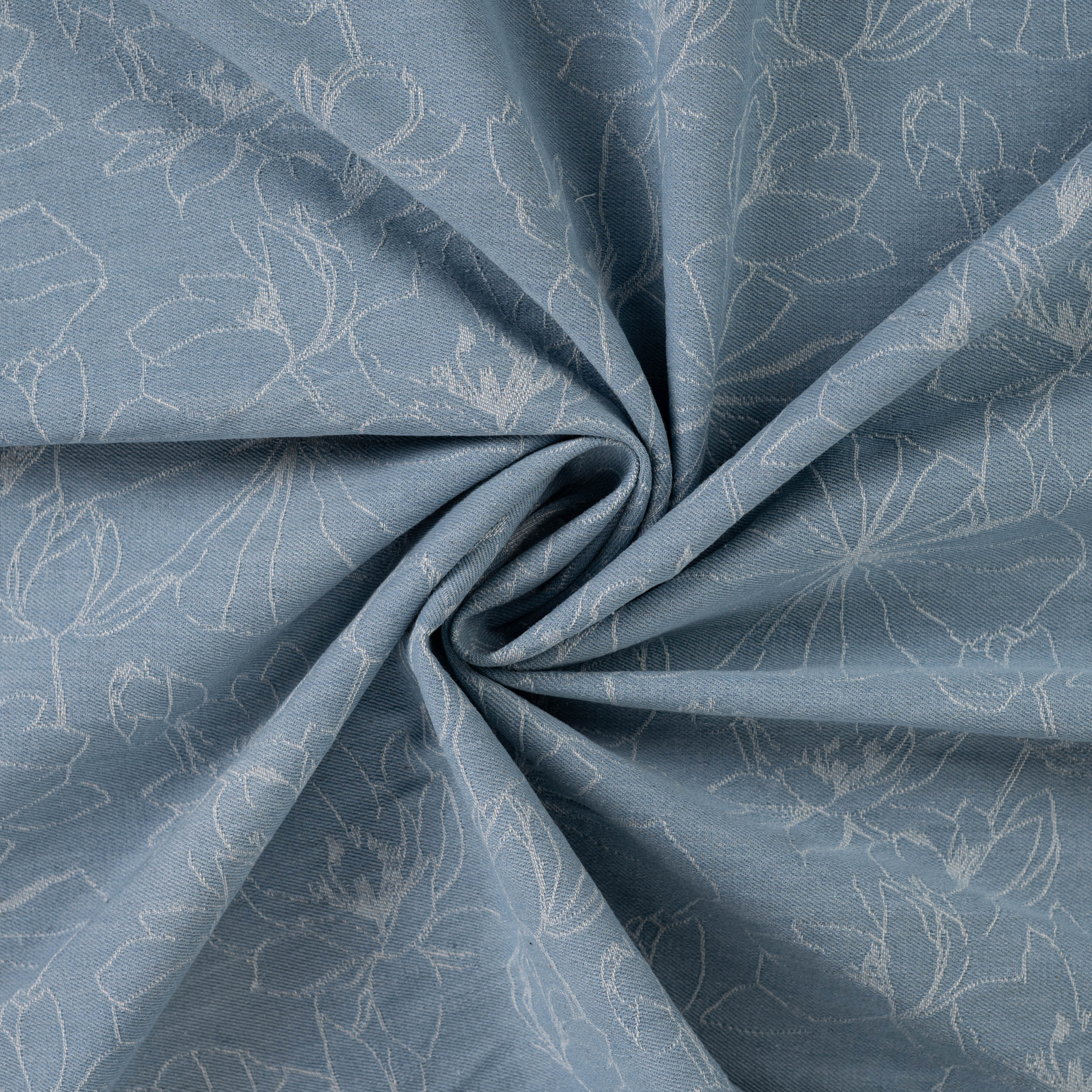Denne smukke denim har et allover jacquardvævet blomstermønster, der giver stoffet et eksklusivt og levende udtryk. Den lyse bund fremhæver mønstret på en elegant og afdæmpet måde, hvilket gør stoffet velegnet til både jakker, bukser, nederdele og tasker.