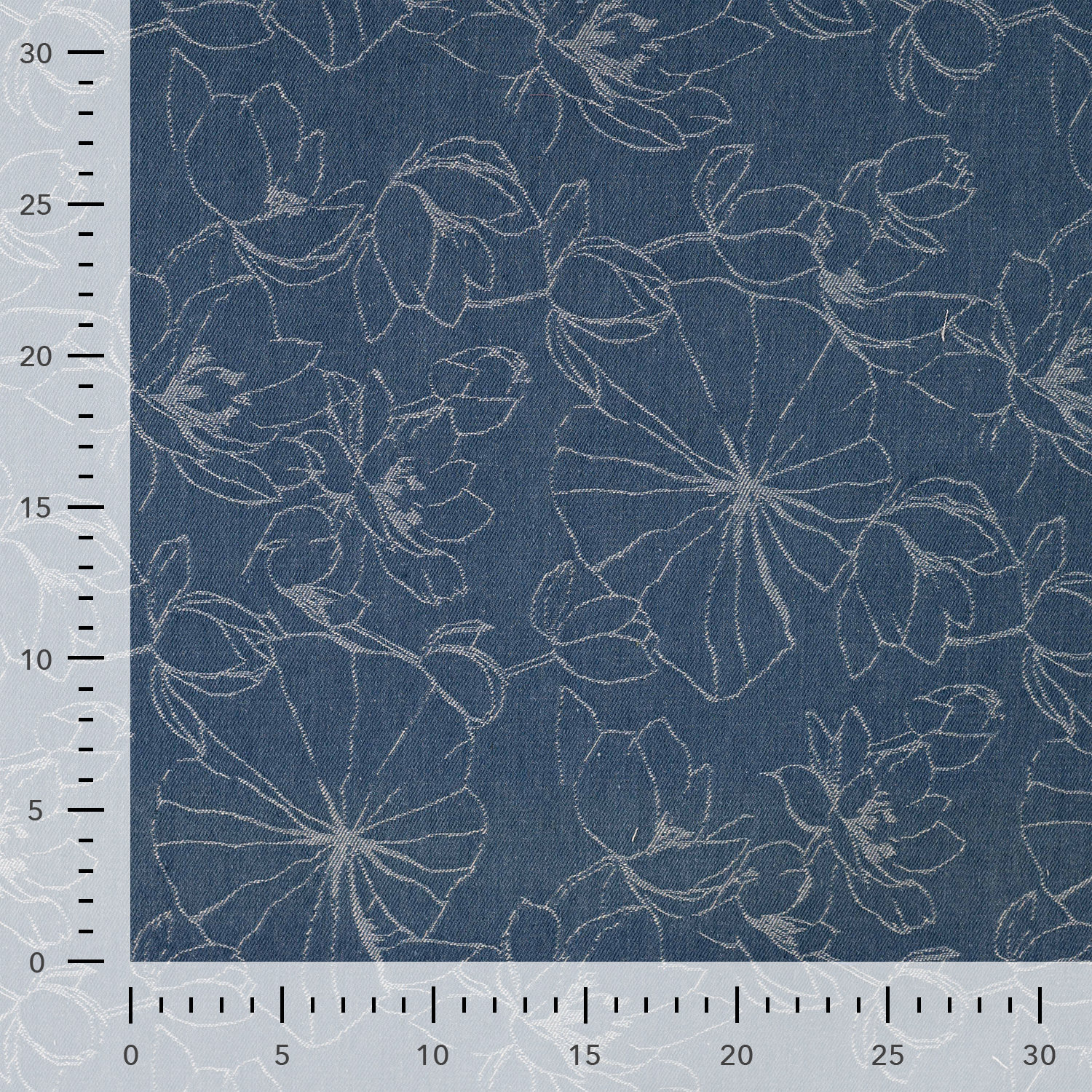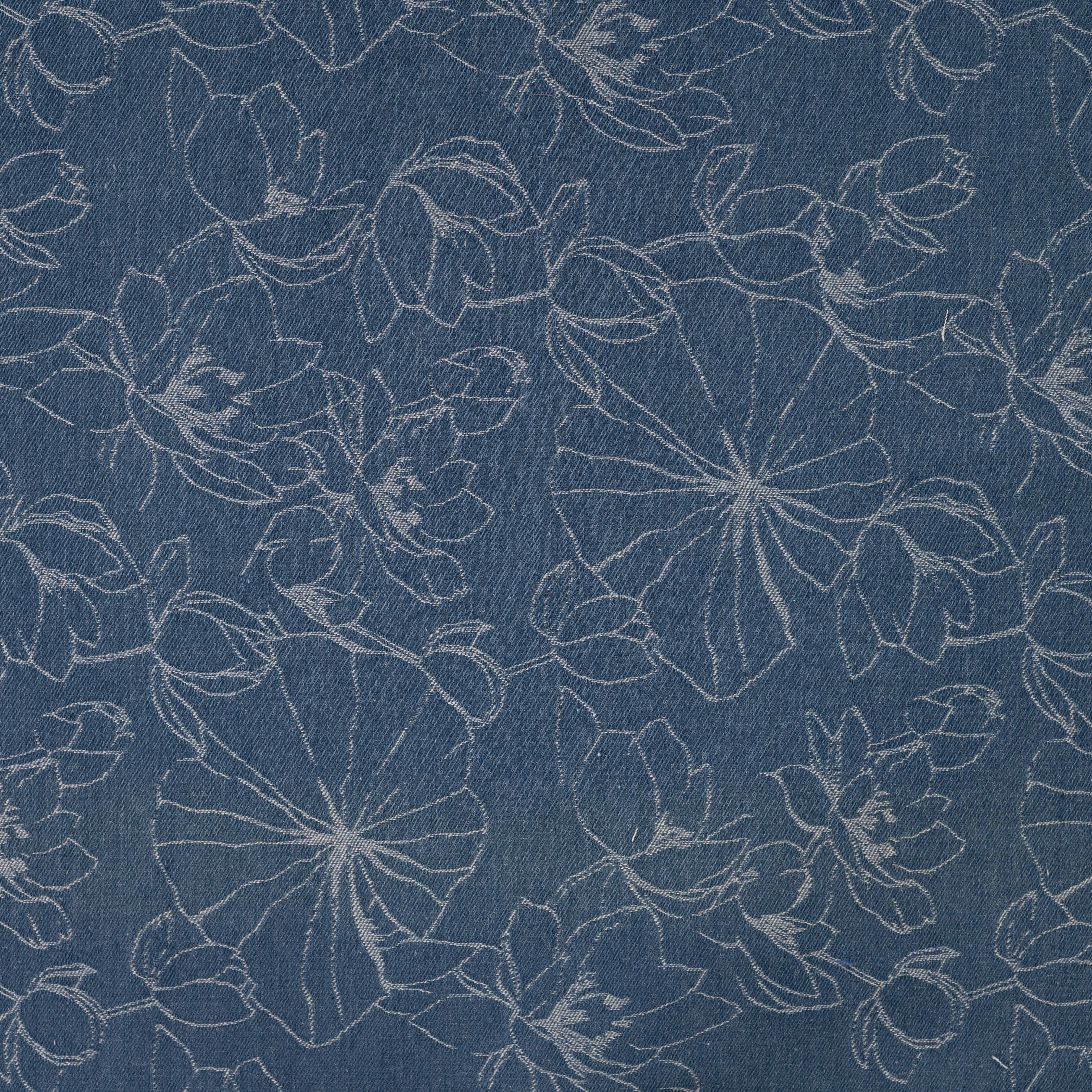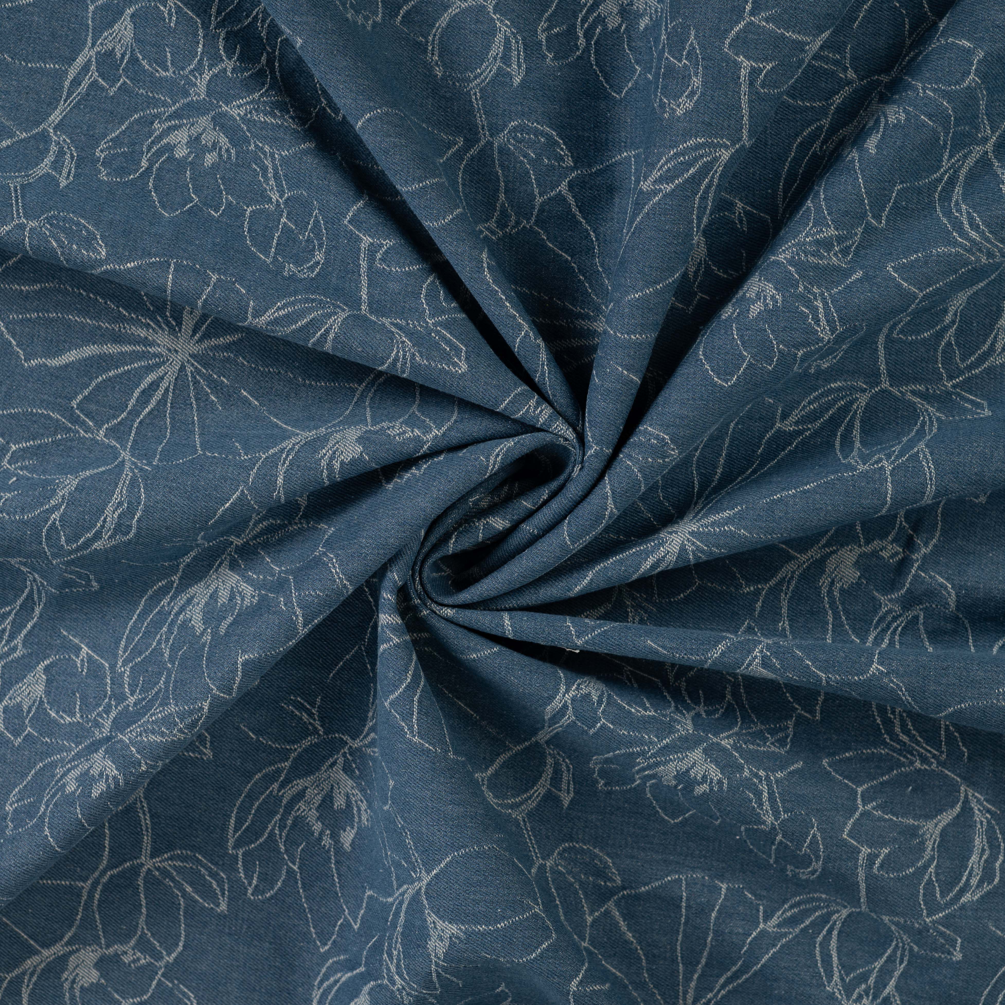 Denne smukke denim har et allover jacquardvævet blomstermønster, der giver stoffet et eksklusivt og levende udtryk. Den mørkeblå bund fremhæver mønstret på en elegant og afdæmpet måde, hvilket gør stoffet velegnet til både jakker, bukser, nederdele og tasker.