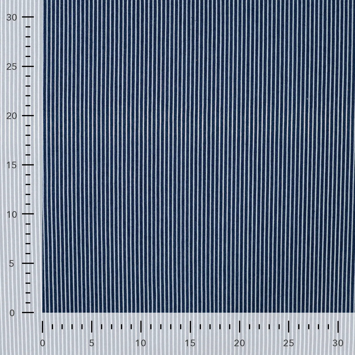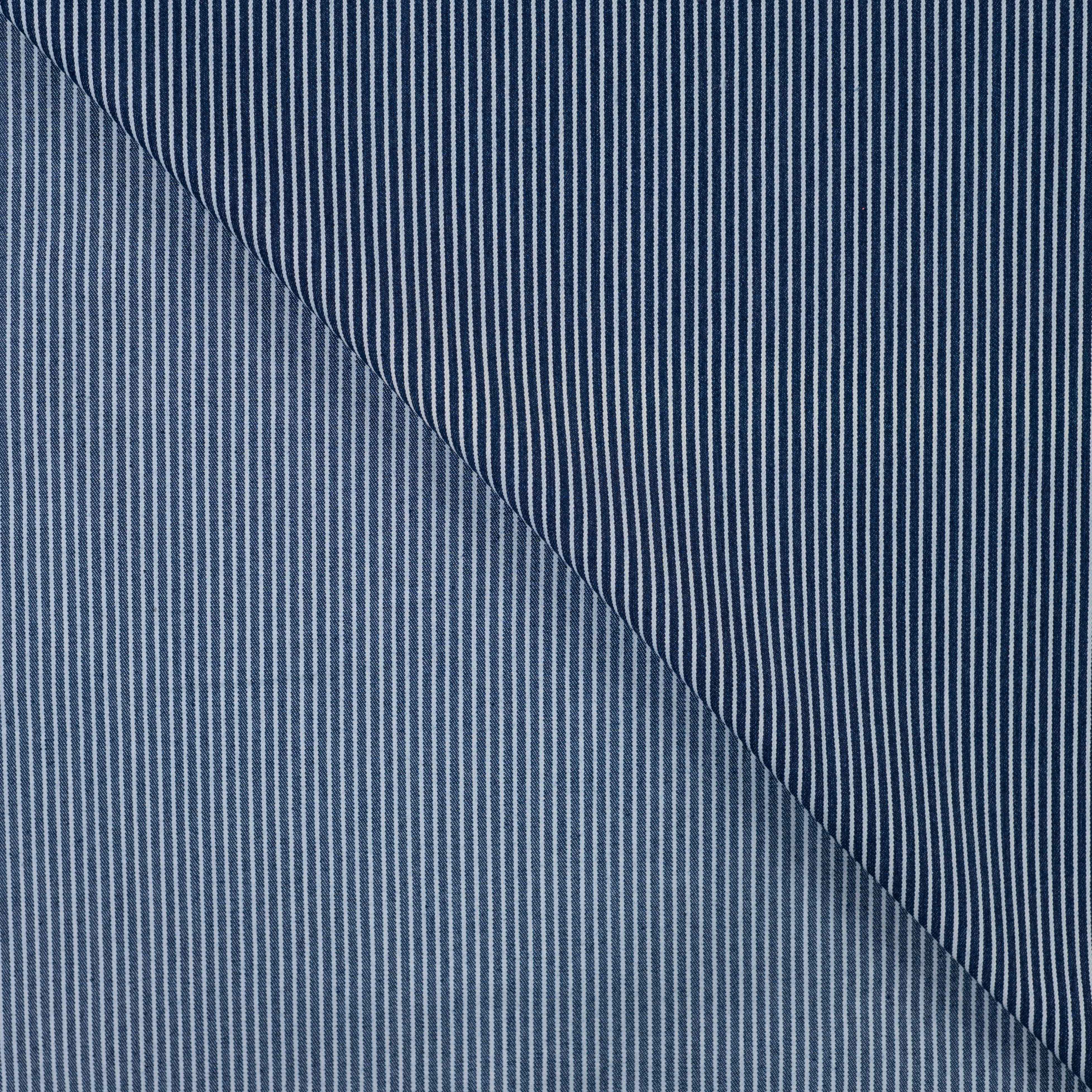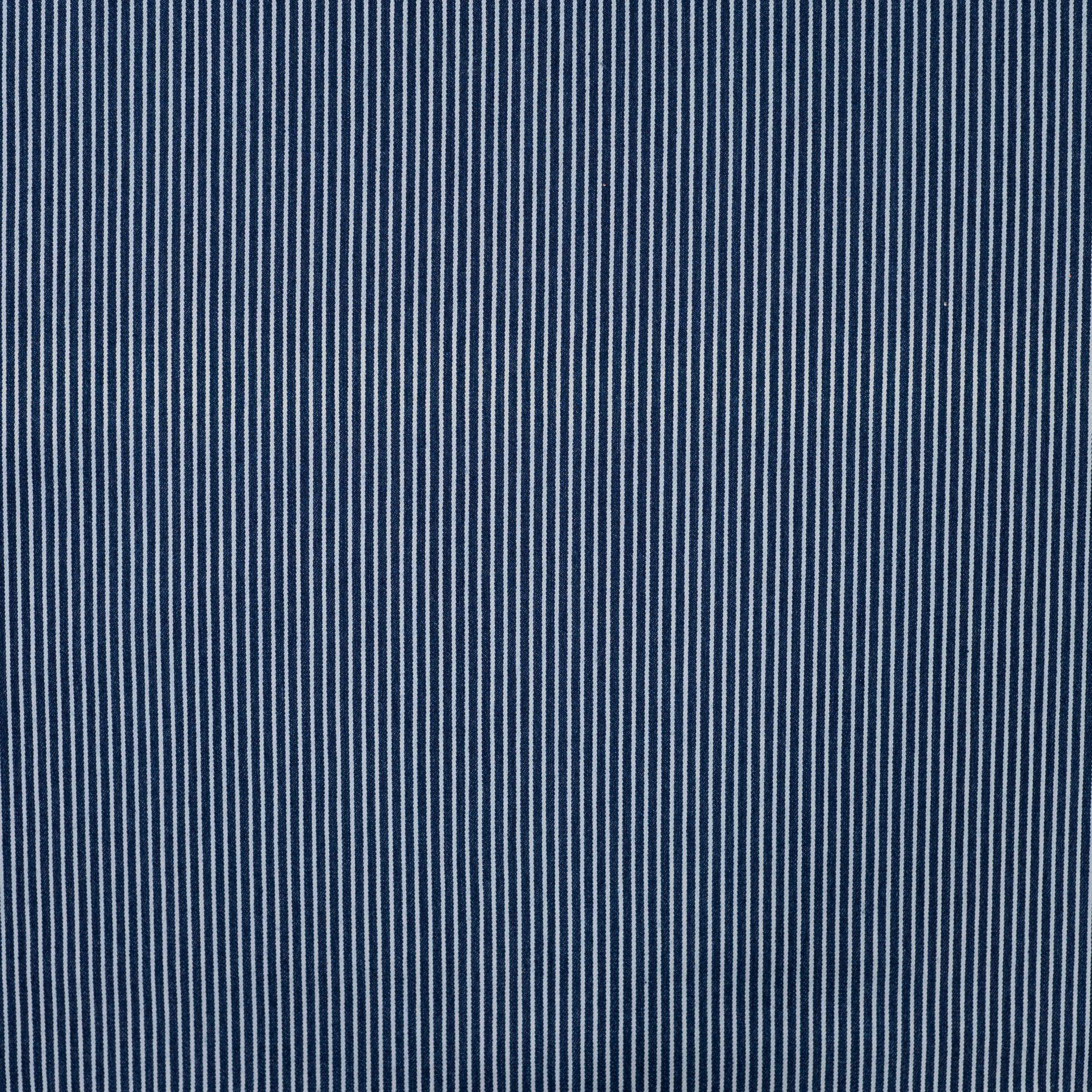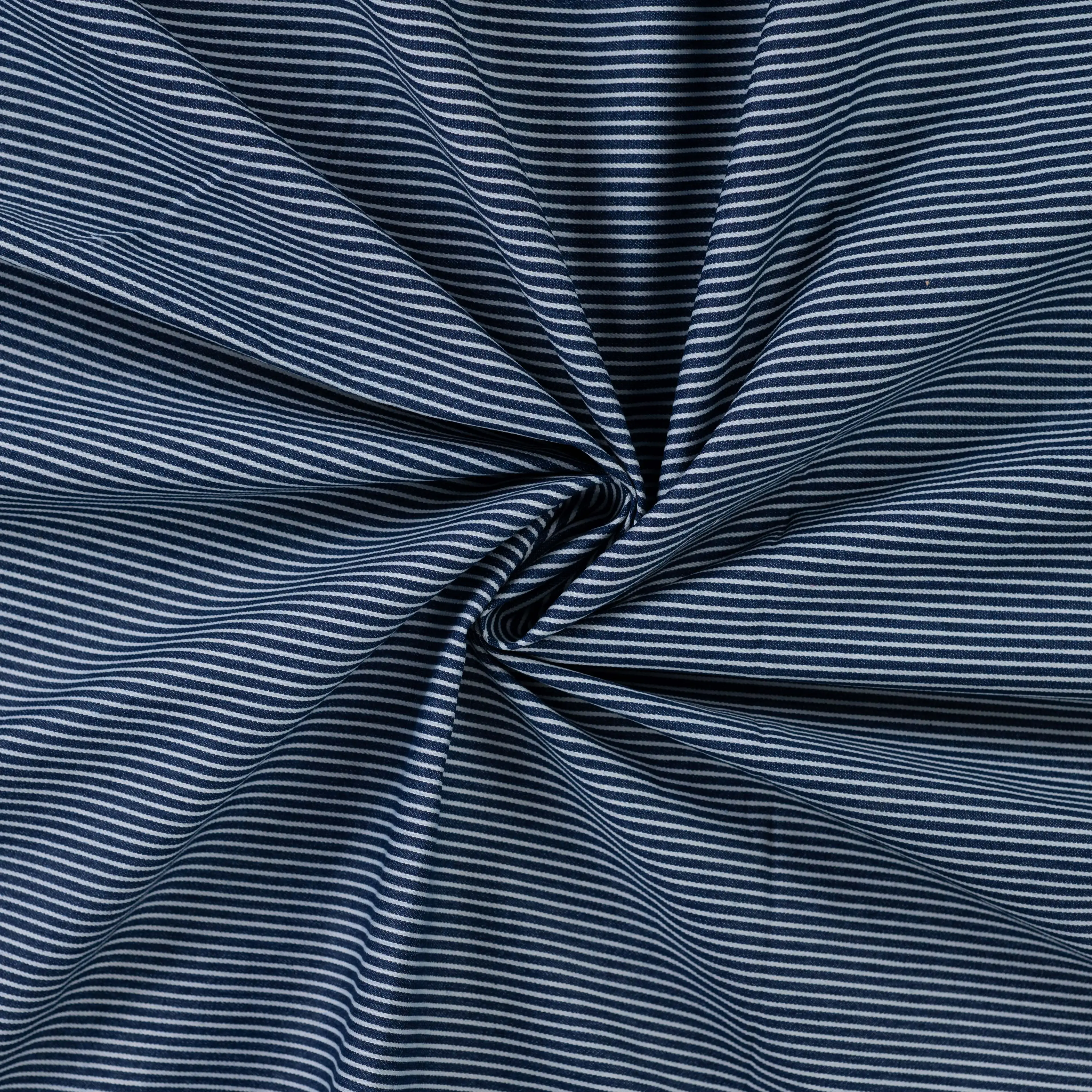 En klassisk, stribet denim i mørkeblå og hvid, med en smule stretch for ekstra komfort og bevægelse. De smalle “mælkedrengestriber” giver et tidløst, rent look, som fungerer lige godt til hverdagstøj som til mere gennemførte styles – og den lette elastan gør stoffet behageligt at have på, også når pasformen er mere tæt.