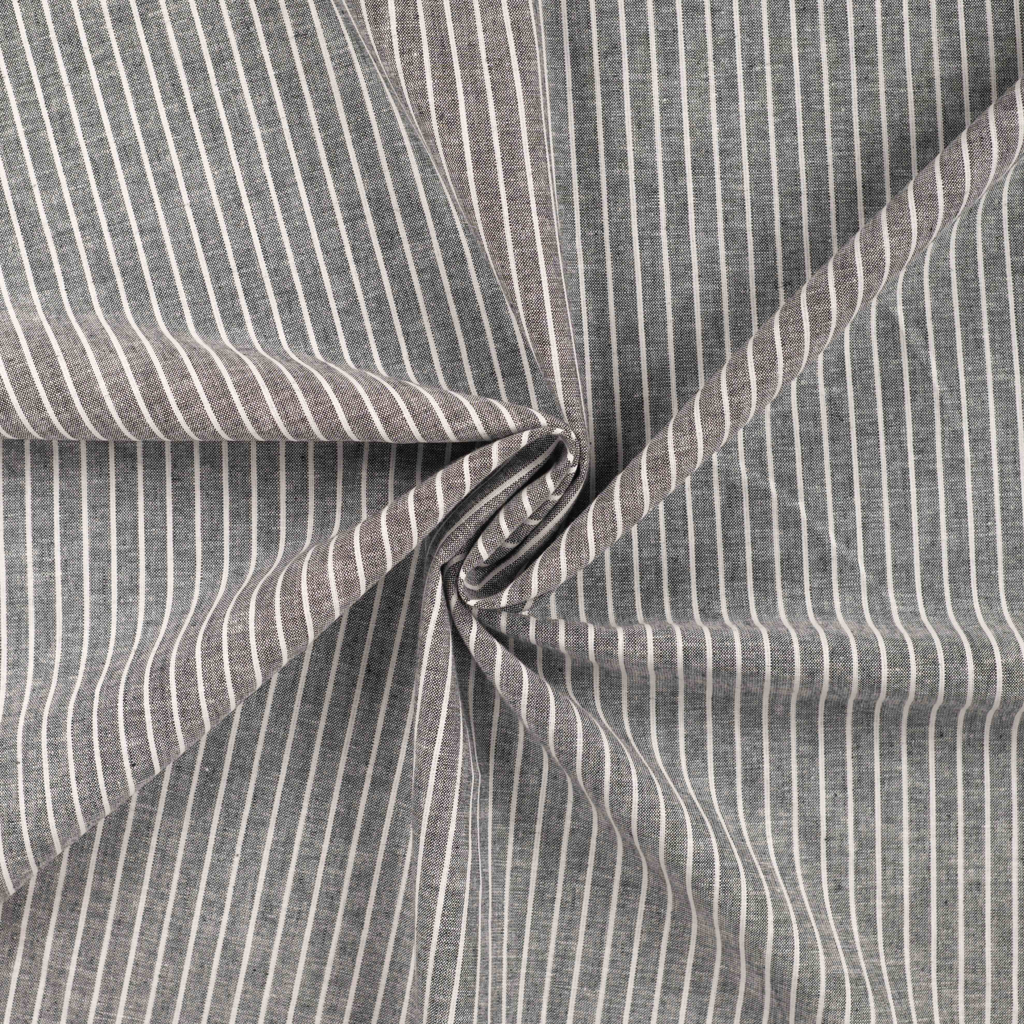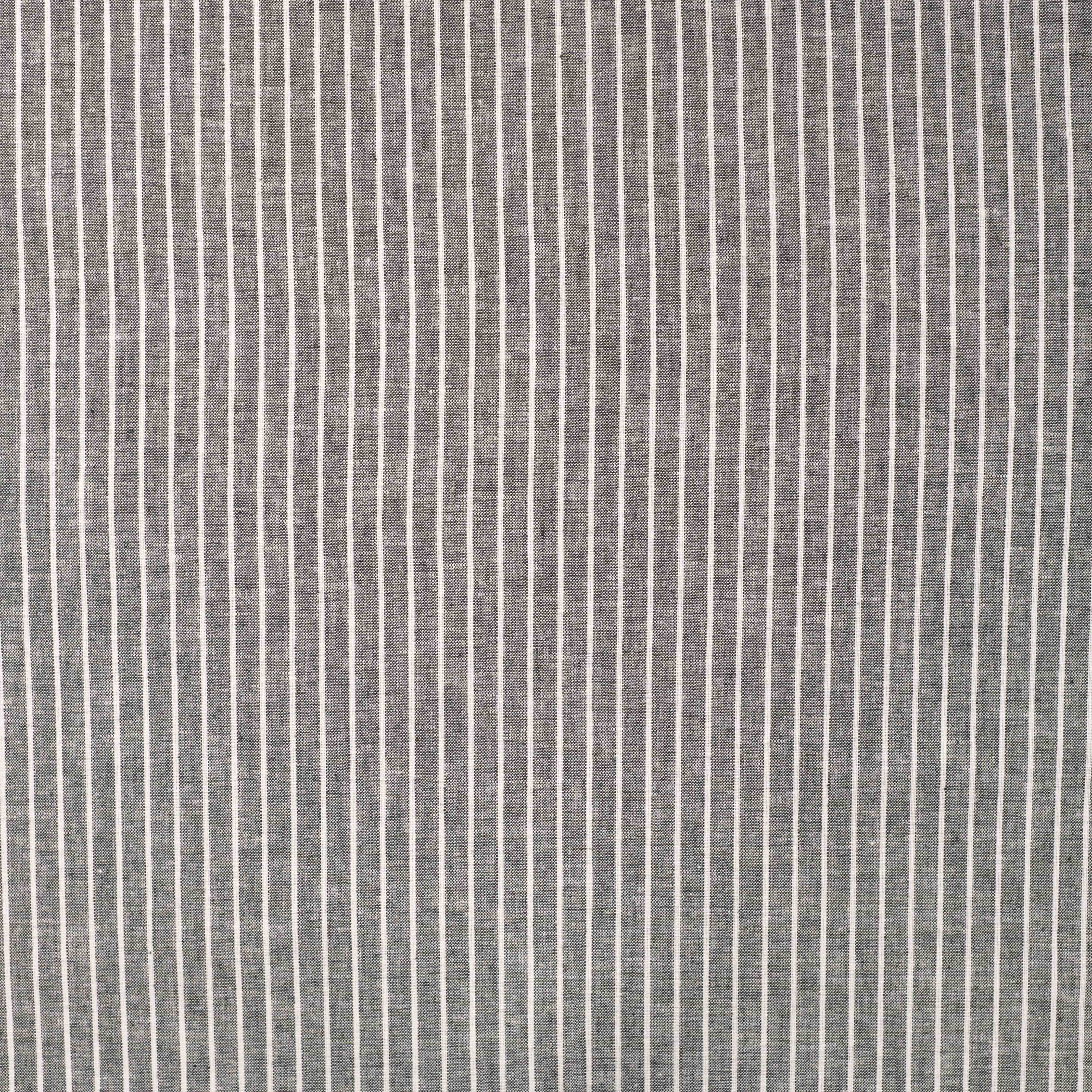 Smuk og tidløs stribet kvalitet i en lækker blanding af hør og bomuld, der kombinerer hørens naturlige, levende struktur med bomuldens blødhed og komfort. Stoffet har et klassisk udtryk med fine lyse striber på en meleret gråsort bund – perfekt til både beklædning og lette boligprojekter.