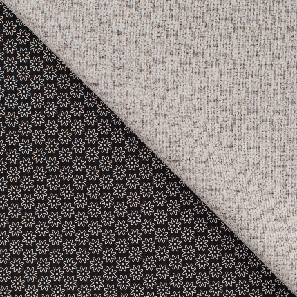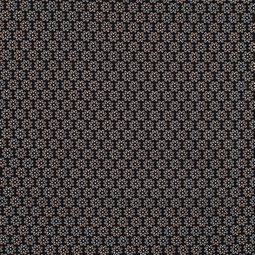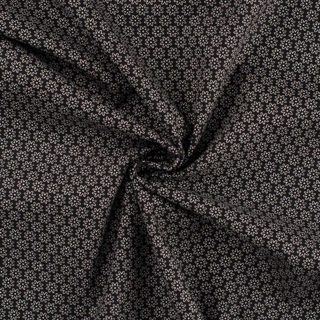 Denne bomuldsmetervare sort i bunden og printet med små hvide blomster – grafisk, enkel og klassisk.