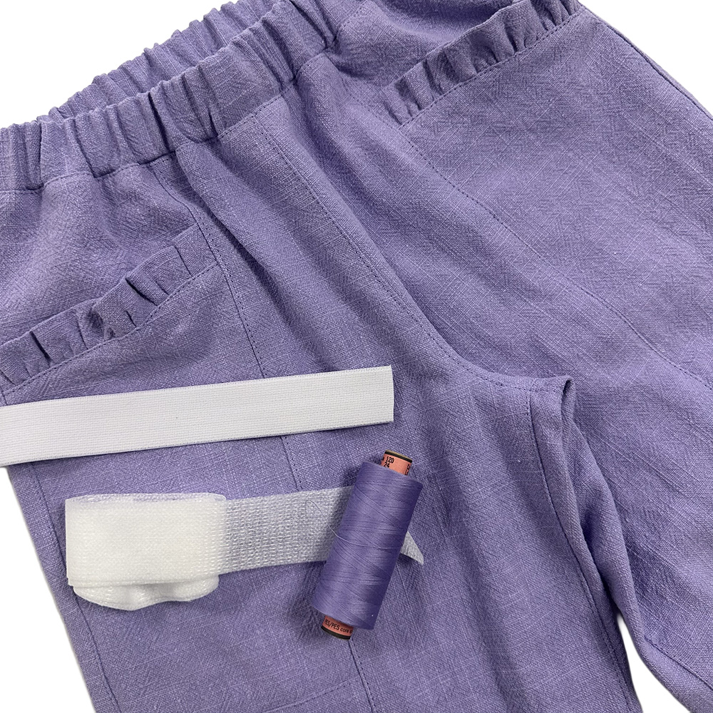 Bukserne har en elastisk talje, som gør dem rare at have på og nemme for børn at bevæge sig i. Modellen har et løst og moderne snit med fine detaljer som lommer foran, mulighed for baglommer samt en variant med flæsedetalje ved lommen. Bukserne kan også sys med elastik i benene, som giver et blødt og afslappet udtryk.